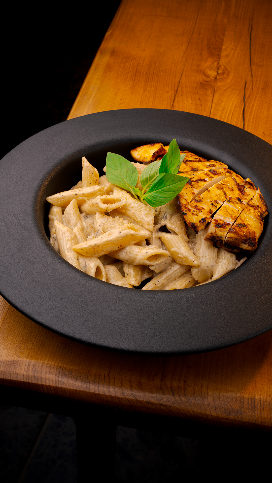 پاستا پنه، سینه مرغ مزهدار شده ، قارچ، سس آلفردو، پنیر پارمزان