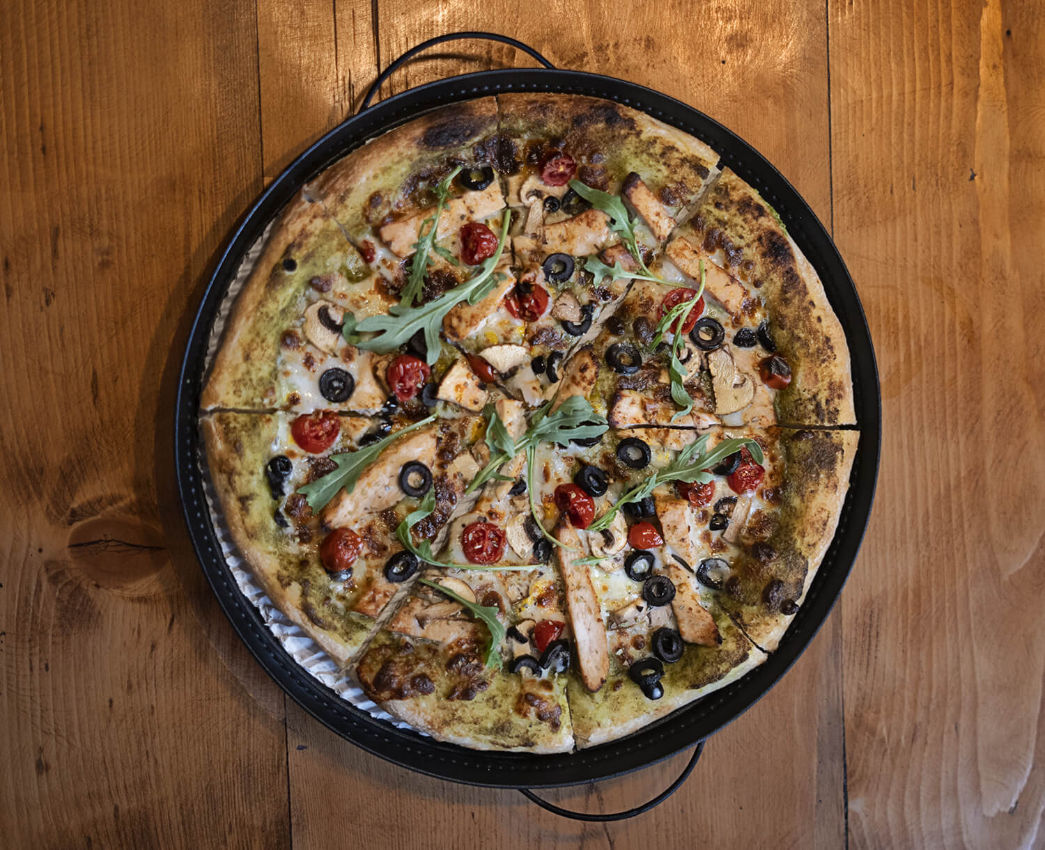 خمیر، سس پستو، سینه مرغ مزهدار شده، بیکن ایرلندی، زیتون سیاه، قارچ، روکولا، گوجه گیلاسی